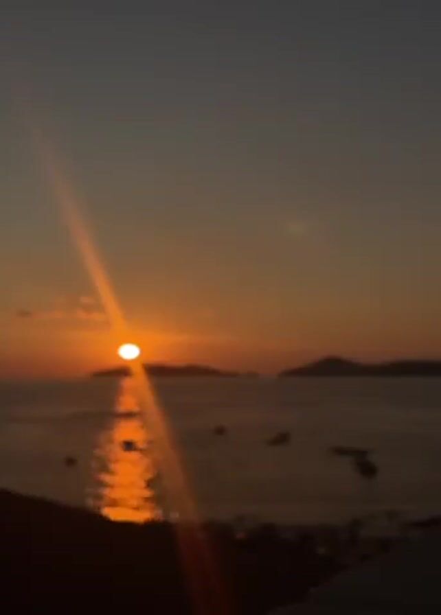 sunset over water. The sun is a bright orange ball setting on the horizon. There is a distinct sunbeam. The water is reflecting the orange sunlight. In the distance, there are dark silhouettes of land, possibly islands. There are also some small dark shapes on the water, probably boats. The sky is a gradient of orange and dark blue. The camera appears to be positioned at a slightly elevated view point. The image is somewhat out of focus.