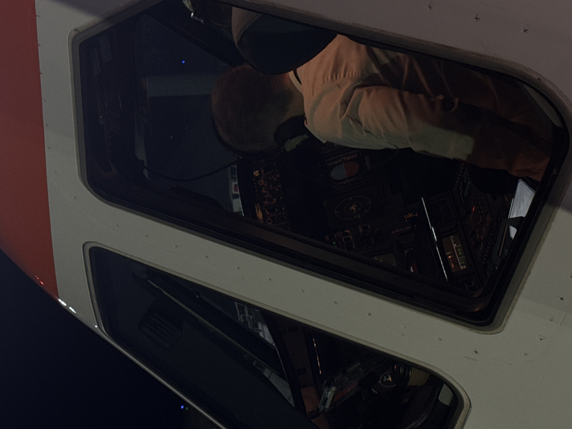 The image depicts the right side of an aircraft cockpit at night, viewed from outside through the windows