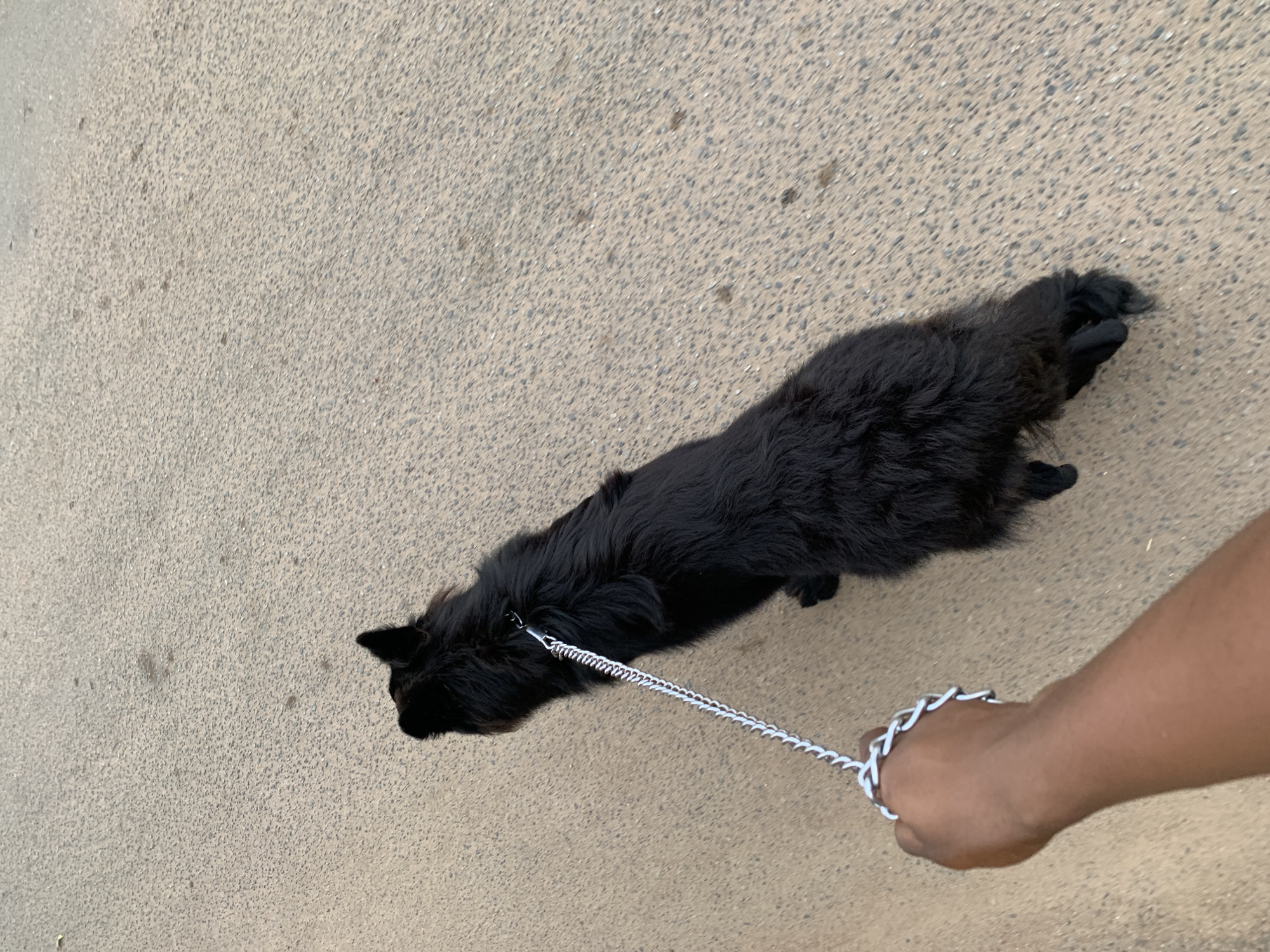 A black, long-haired dog lies prone on a textured gray surface, possibly concrete or asphalt. The dog is leashed with a silver chain that is held by a dark-skinned hand. The setting appears to be an outdoor area, possibly a sidewalk or road. No specific location in Barakin Akawo, Nigeria is identifiable.
