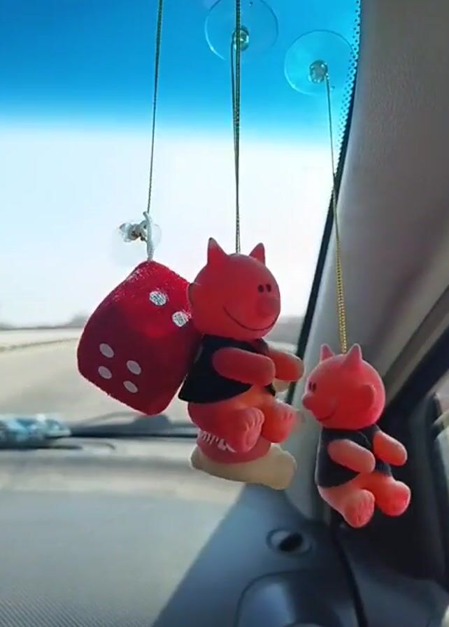 A video shows fuzzy dice and red devil figures dangling from the windshield of a car, swaying gently as the car travels down a highway on a bright, sunny day. The dice are red with white spots, and the devil figures are red with black shirts. The figures hang from thin, gold-colored strings attached to suction cups affixed to the windshield. The video is taken from inside the car, capturing a portion of the dashboard and the road ahead through the windshield.
