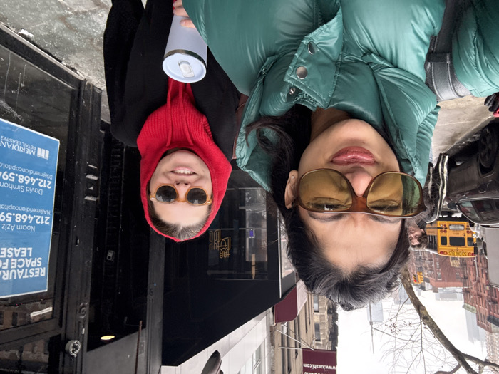 Two women pose outdoors. One on the left wears a red hooded scarf and sunglasses, holding a white water bottle. The woman on the right wears a green puffer jacket and large brown sunglasses. Behind them is a city street with buildings, cars, and a yellow school bus. A blue sign advertises restaurant space for lease with contact information for Noam Aziz and David Simhon at Meridian Retail Leasing. The website "www.karahi.com" is also visible.