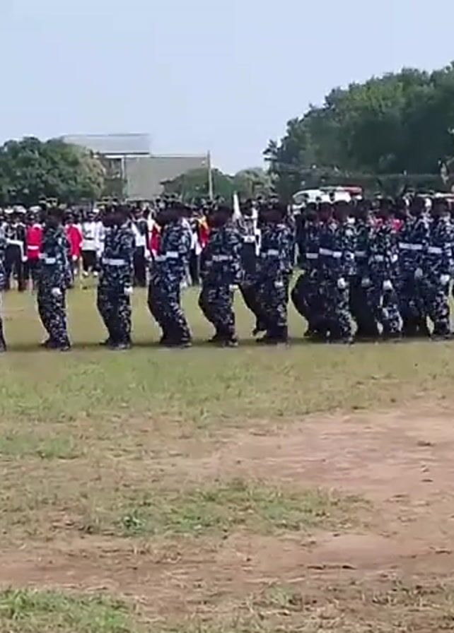 A group of people in matching uniforms are marching in a line on a grassy field. The uniforms are primarily dark blue with white and black patterns. Some individuals wear red jackets with black accents. The field is surrounded by trees, buildings, and additional people standing in formation. The sky appears overcast. The camera captures the scene from a ground-level perspective.