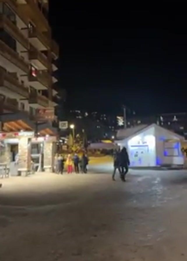 night scene in a snowy town. There are people walking on a snow-covered path. On the left, there's a multi-story building with lights. To the right, there are small structures, some illuminated with blue and red lights. In the distance, lights from other buildings dot the dark sky. The camera seems to be moving slowly along the path.