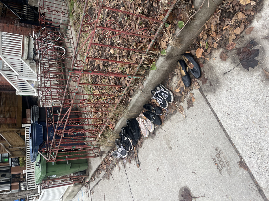This image displays a static residential street scene in Toronto, Canada. The foreground consists of a concrete sidewalk with the inscription "BDOLI 2009 STRUGGLA" stamped into its surface. Eleven pairs of shoes, including athletic sneakers, casual flats, and dress shoes, are lined neatly along the edge of a raised garden bed. The garden bed is covered with dried brown leaves and sparse, dead vegetation. A weathered, dark red wrought iron fence with decorative scrollwork runs parallel to the sidewalk, delineating the property boundary. Beyond the fence, a green wheeled waste bin and a blue wheeled waste bin are visible alongside a white picket fence. In the background, a red-brick residential building with white outdoor stairs and matching railings leads to an elevated entrance. A bicycle with white-rimmed wheels is parked near the building's stairs. The environment is marked by scattered fallen brown leaves, suggesting a late autumn or early winter season. No individuals are visible in the scene.