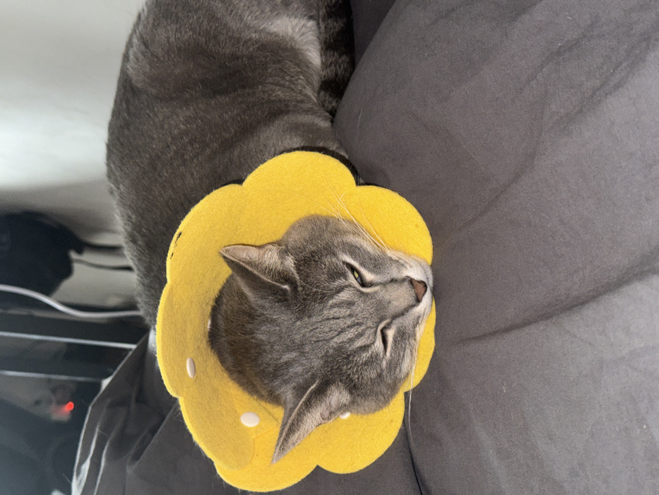 A grey tabby cat with distinct facial stripes is depicted lying on a dark grey fabric surface, likely bedding, with its eyes partially closed in a state of rest. The cat is wearing a bright yellow, soft, flower-shaped Elizabethan collar, secured by small white fasteners, which frames its head. In the blurred background, dark electronic devices, cables, and a single red indicator light are visible against a lighter wall, indicating an indoor environment. This scene is located in the city of Moscow, Russia.