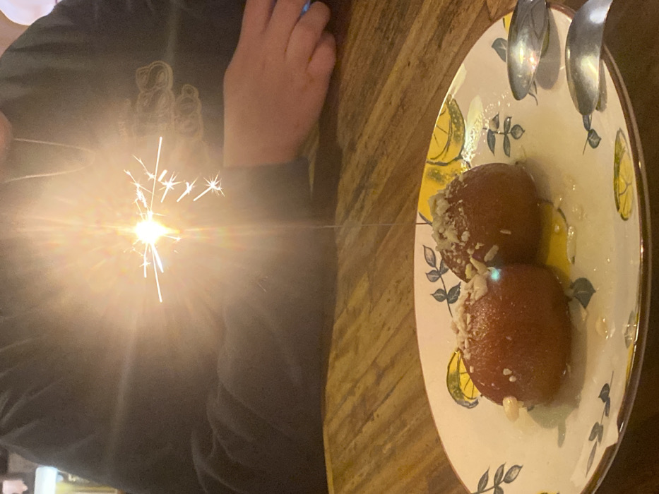 A person holds a lit sparkler. Next to them is a plate with two gulab jamun, topped with shredded nuts, on a lemon-patterned plate. Two spoons rest at the edge of the plate. A wood surface is visible. The person is wearing a dark-colored hoodie.