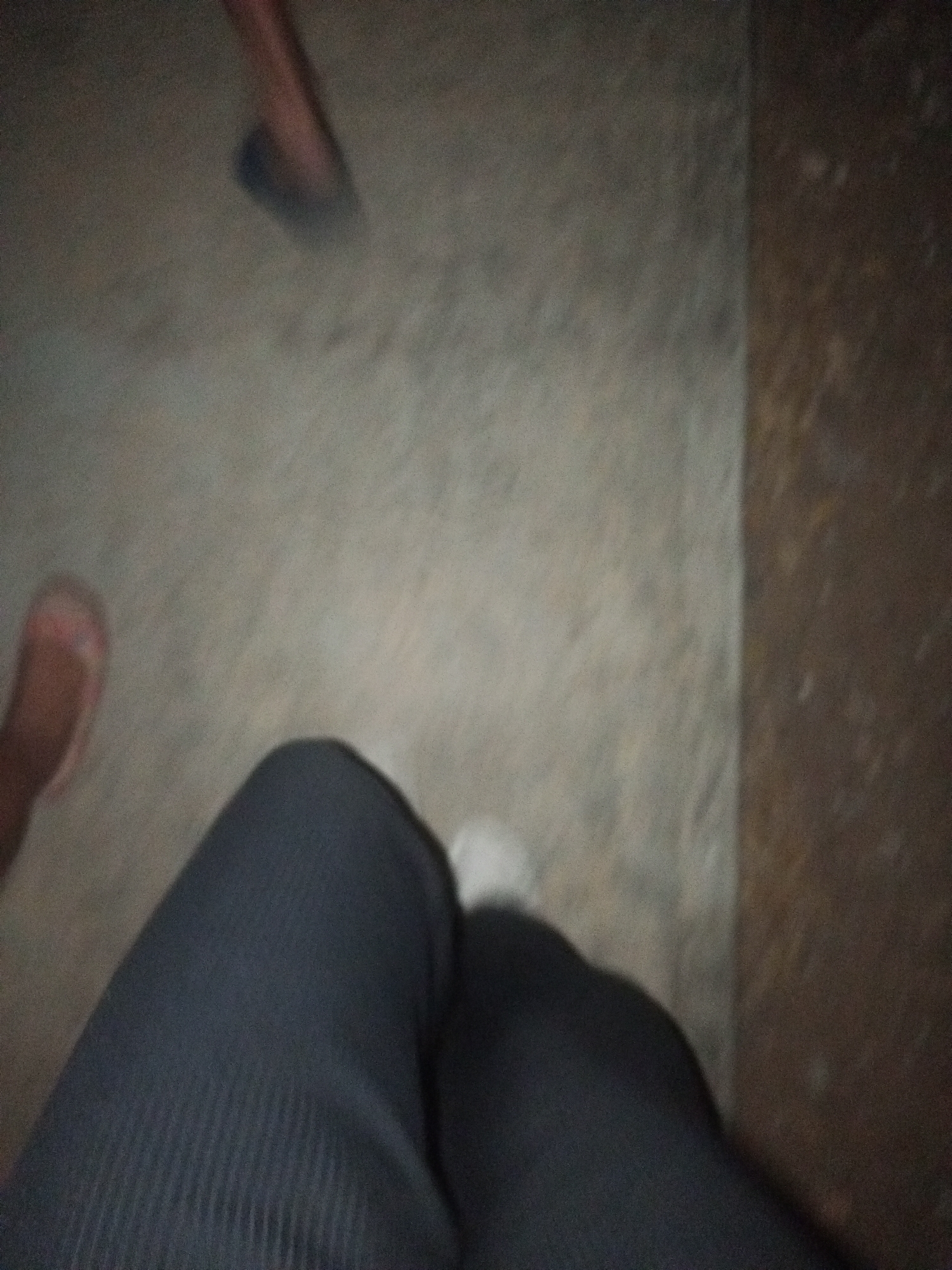 A blurred, low-angle photograph depicts a floor surface and parts of three individuals. The foreground contains a pair of legs clad in dark, ribbed pants, with a foot in a white sneaker visible. In the background, two feet are seen: one in a blue sandal, the other appearing to be bare. The floor is light-colored and possibly concrete. A darker brown wall is on the right edge of the frame. No information is available to confirm it is in Juan Griego, Venezuela.