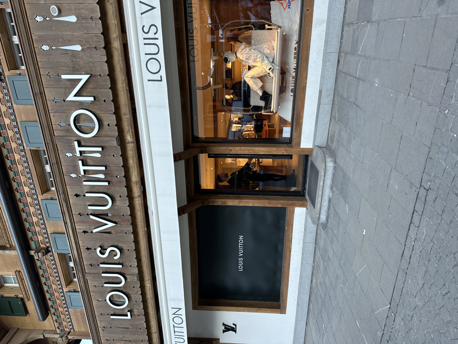 The image depicts the exterior of a Louis Vuitton store in Gstaad, Switzerland
