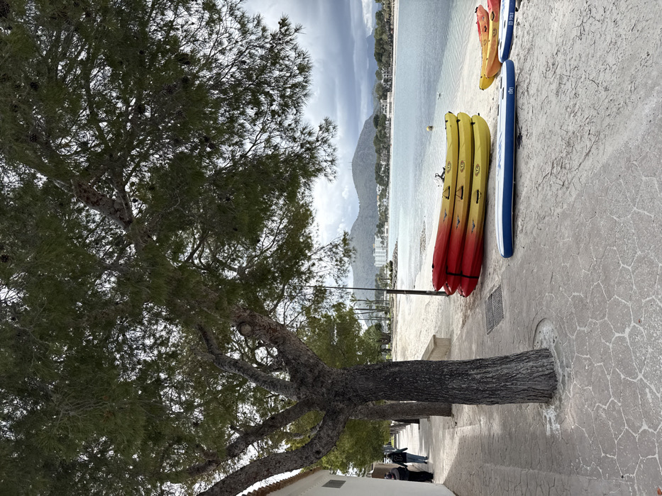 The image depicts a coastal scene in Alcúdia, Spain, viewed from a paved promenade running parallel to a sandy beach. A large pine tree with a textured trunk dominates the mid-left foreground, its dense green foliage extending across the top of the frame. To the left, a white building lines the promenade, where two individuals are observed walking away from the camera. The promenade features patterned paving and integrated metal drain covers. On the adjacent sandy beach, six kayaks are stacked horizontally: three yellow kayaks on top of three red kayaks, secured together. To their right, two inflatable paddleboards lie flat on the sand; the visible one is blue and white, and another, partially visible, is orange/red and white. A tall, thin black pole stands upright on the beach. The sandy beach transitions into a calm body of water, likely a bay or inlet. A yellow buoy and a white bird are present in the water. The distant shore features a line of buildings, including a prominent multi-story white structure, backed by green, undulating hills or mountains. The sky is partially obscured by grey clouds.