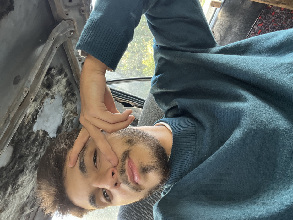 A young man with a beard poses inside a car. He wears a teal sweater, its texture visible. His hand is raised to his face in a gesture. The car's interior is in disrepair, with exposed insulation on the roof. A window is visible behind him, showing foliage outside. The seat is gray. The image is slightly tilted, giving a casual and off-center perspective.