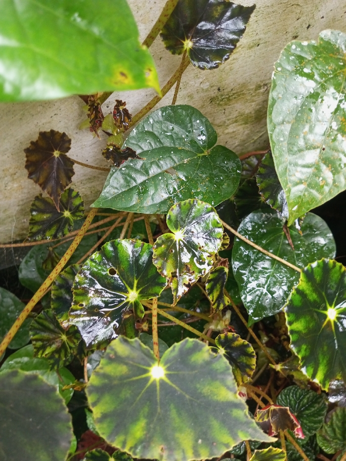 The image depicts a close-up of dense plant foliage against a textured concrete surface in Khammam, India. The scene features two primary types of leaves. Dominating the upper and central areas are several large, dark green, heart-shaped leaves, some showing small white speckles or water droplets. Interspersed below these are numerous smaller, rounded leaves with distinct radial patterns of dark green and lighter green-yellow, consistent with *Begonia* species. Many of these patterned leaves appear wet, exhibiting a shiny surface, and some show minor holes and irregular edges. Thin, reddish-brown stems with light speckling are visible supporting these leaves. A large, out-of-focus bright green leaf occupies the upper left foreground. The background is a weathered, light grey or beige concrete wall. A faint spiderweb is present among the foliage on the left side. No people, actions, or interactions are visible.