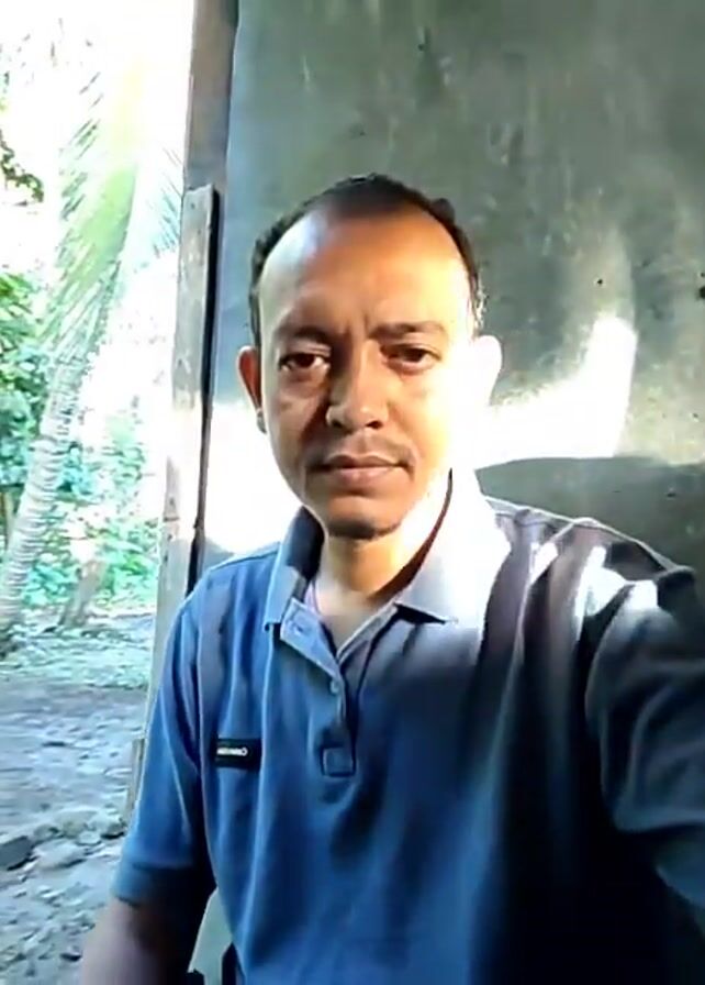 A man stands in front of a doorway, illuminated by a patch of sunlight. He wears a light blue polo shirt. Outside the doorway is an area with vegetation and a palm tree. The background wall is a textured grey.
