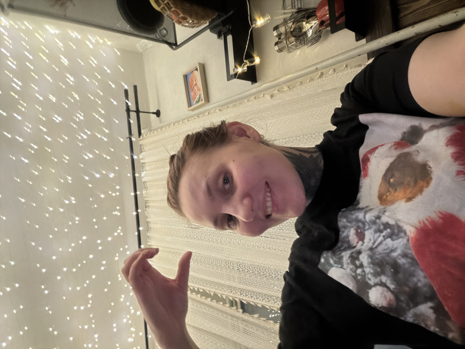 A person with neck tattoos smiles toward the camera. They are wearing a black shirt with a white image of Santa Claus on it. Their hand is raised, partially obscuring a wall of fairy lights. Behind them is a patterned white curtain. Above the person is a wall-mounted shelf unit holding various items, including kitchen utensils and a giraffe figurine. A framed picture hangs on the wall between the curtain and shelf.