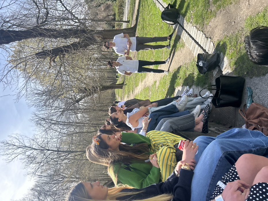 group of young people gathered in a park near the Acueducto de Segovia in Segovia, Spain (latitude: 40.954, longitude: -4.121). The group is seated on a low stone wall, facing a pair of young men standing further down a paved path. The group of young women consists of eight individuals, some of them wearing sunglasses. One of the women is wearing a green sweater over a striped shirt, and another is wearing a black and white polka dot dress. The group appears to be engaged in conversation with the two men, who are both dressed casually. One man is wearing a white t-shirt and the other is wearing a grey t-shirt. There are trees and grass in the background, and the ground is covered in a mixture of grass and paved paths. A black bag is sitting on the ground near the group, and a larger black bag is sitting further down the path.
