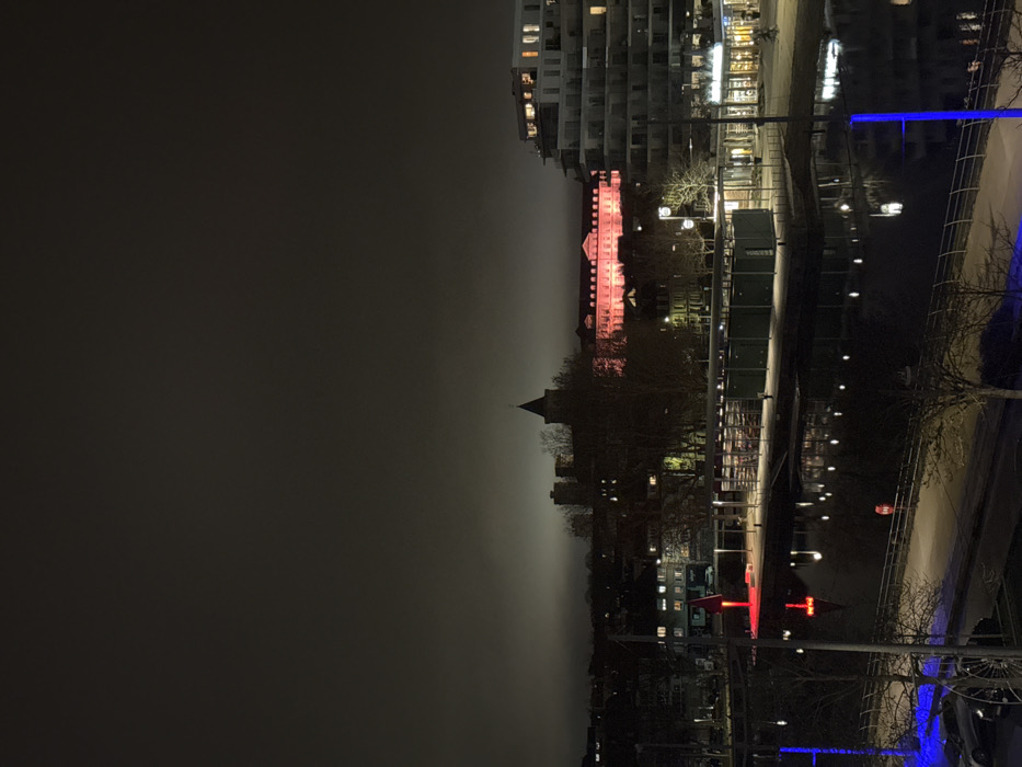 An urban nightscape reveals a canal reflecting city lights. A building glows a vibrant red, contrasting with the darker surroundings. Tall apartments stand on one side of the canal, while trees line the water's edge. A smaller structure with a pointed roof adds to the architectural diversity. Blue light accents a foreground railing, and the dark sky blends with the city's subtle glow.