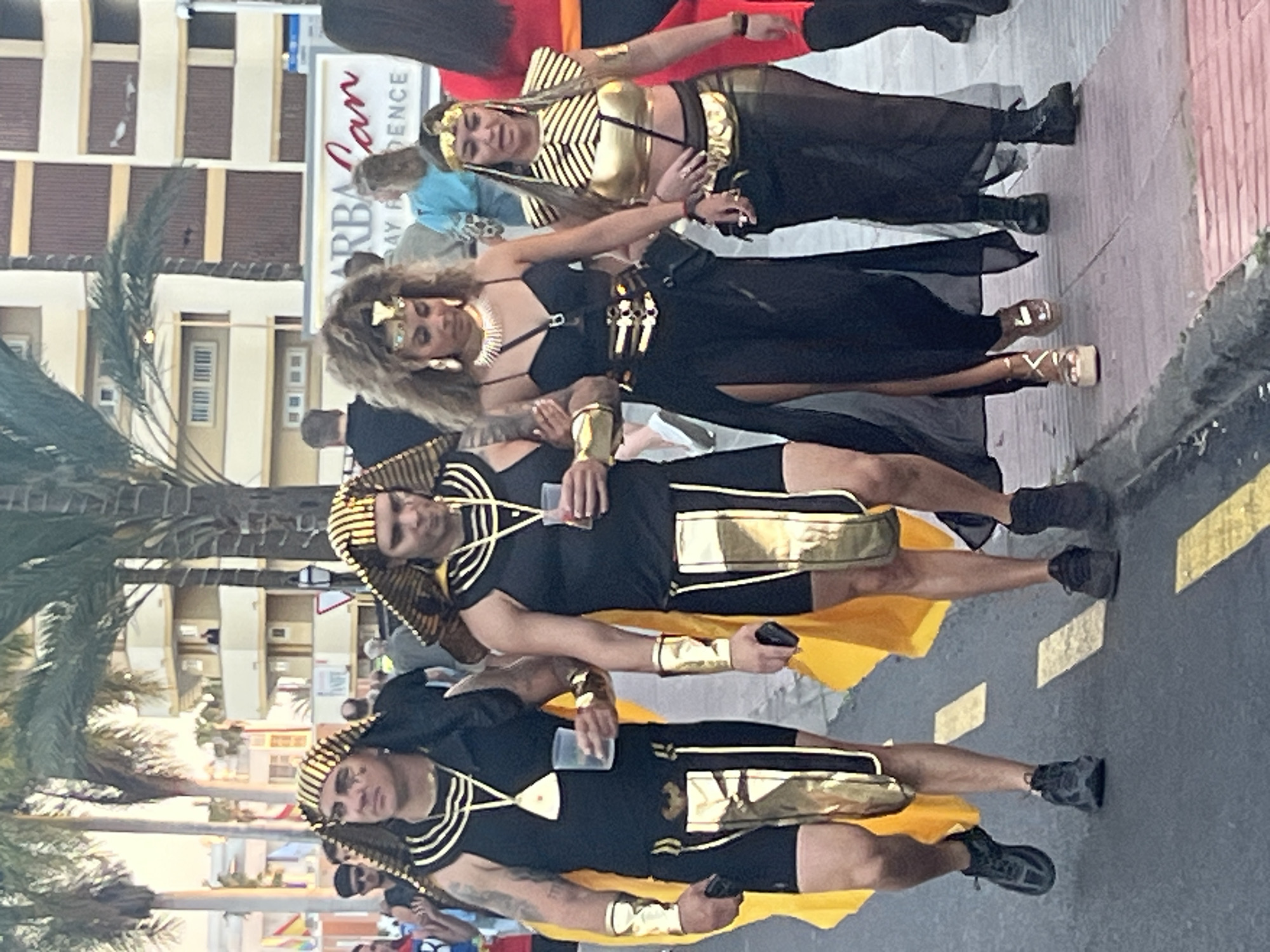 The image captures a group of people in costume in San Bartolomé de Tirajana, Spain. Two men in the foreground are dressed in Egyptian-themed costumes of black and gold, each wearing a pharaoh headdress. The man closest to the camera has a cup in one hand and a phone in the other. Behind them is a woman in a black dress and wig with a gold headdress and necklace. Another woman further back is dressed in a gold top and black skirt, also wearing a gold headdress. The backdrop features buildings and palm trees. The location is likely a street in the city. The street surface is visible in the lower right corner.