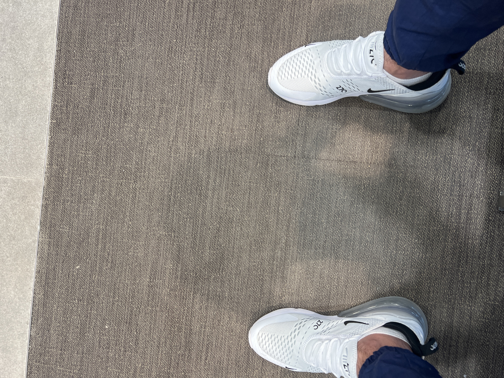 - "person's feet wearing white Nike Air Max 270 sneakers and navy blue pants standing on a brown textured surface, possibly carpet" by FM-3WI9J3, licensed under CC BY 4.0