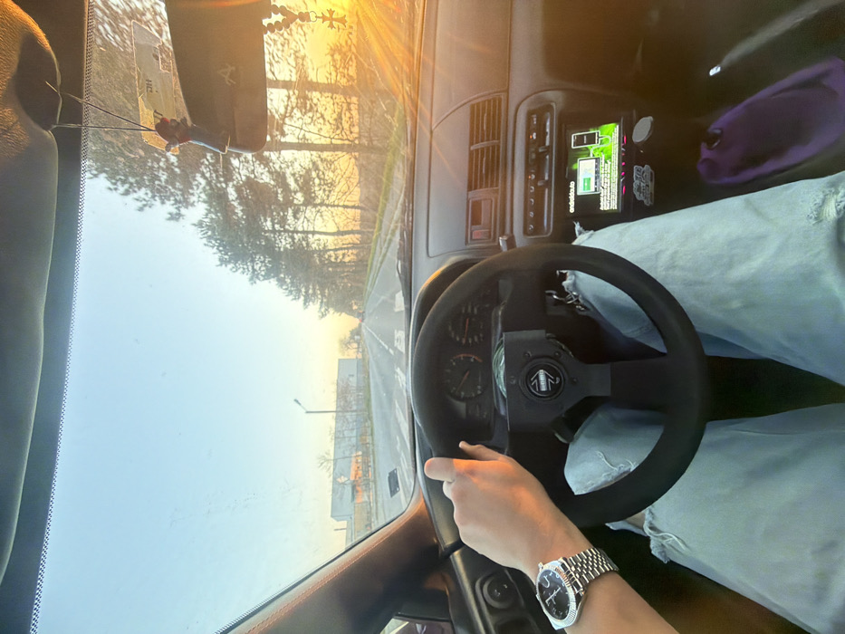 The image depicts a driver's perspective from within a vehicle traveling on an asphalt road in Yambol, Bulgaria, during what appears to be late afternoon or early evening. **Scene Overview:** The viewpoint is from the driver's seat, looking forward through the windshield. The road extends straight into the distance. A clear sky with a low sun on the right horizon casts a warm, golden light across the scene. **Vehicle Interior:** The driver's right hand, adorned with a metallic wristwatch featuring a fluted bezel and a Jubilee-style bracelet, rests on a black MOMO aftermarket steering wheel. The driver's legs are visible, clothed in light-wash, ripped jeans. The dashboard, instrument cluster with visible gauges, and an aftermarket infotainment head unit are present. The head unit displays a green interface, with the text "androidauto.io" visible. A purple object, possibly a slipper or a soft bag, rests on the passenger floor. From the rearview mirror, two items hang: a small red figure and a string of dark beads with a metallic cross pendant. **Exterior Environment:** The two-lane asphalt road features solid white lines separating the lanes and a dashed white line for the center. On the left side of the road, a large, light-colored industrial or commercial building is visible. Further down the road, additional structures and a single street light pole are present. The right side of the road is lined with a row of tall evergreen trees, behind which the setting sun casts a strong glare and warm orange hues. The sky overhead is light blue. **Location in Yambol, Bulgaria:** The scene suggests an arterial road or an access road to an industrial or commercial zone within or on the outskirts of Yambol, Bulgaria, characterized by the industrial building on the left and a natural tree line bordering the right.