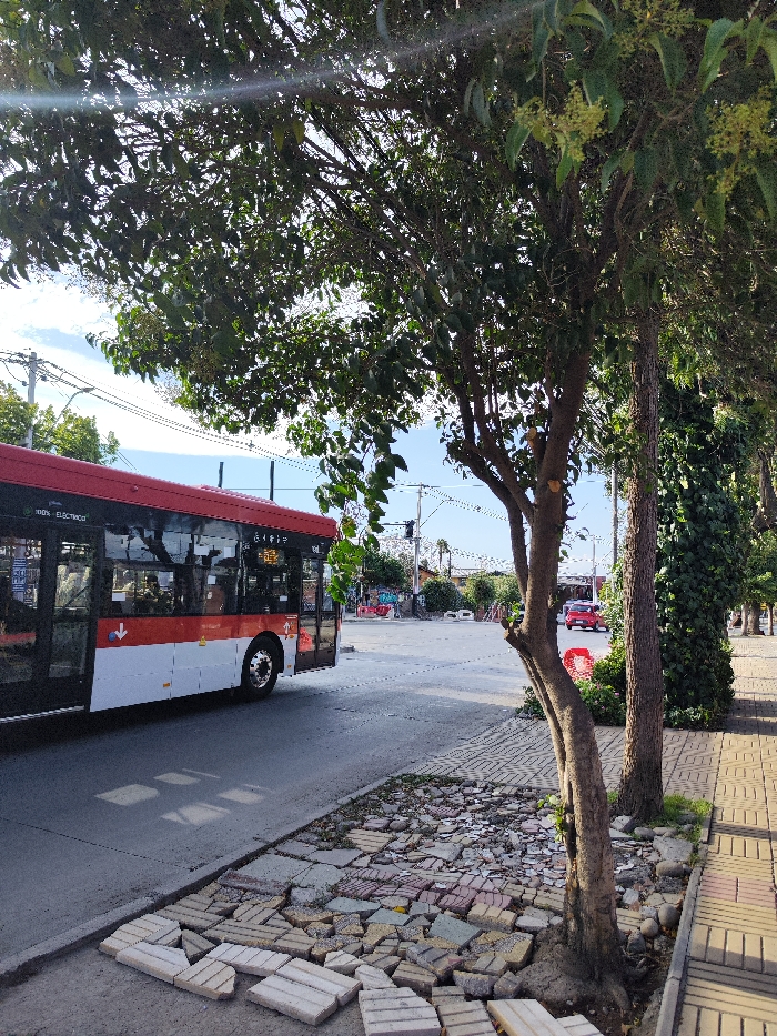 A red and white bus is traveling down an asphalt street, with a sidewalk on the right. The sidewalk is partially paved with tan brick tiles, some of which are broken and scattered. Two trees grow from the sidewalk, one of which is wrapped in ivy. A red car is visible in the distance at an intersection with a traffic light. The scene is partially shaded by the trees.