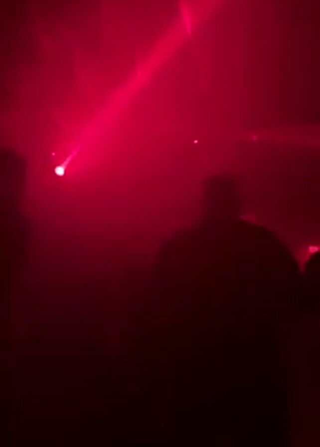 dimly lit space, possibly a nightclub, bathed in red light