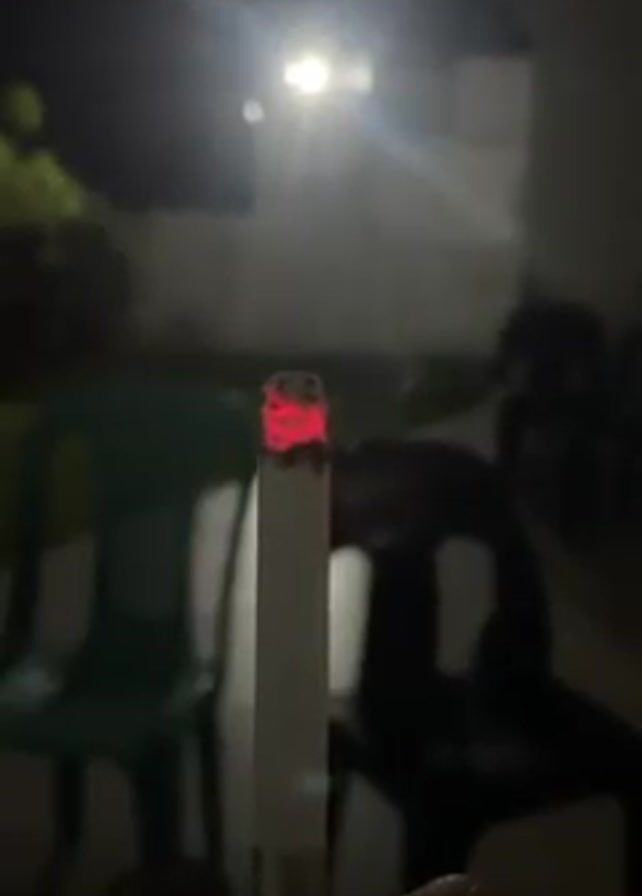 lit cigarette held in someone's hand. The tip of the cigarette glows red, and smoke is rising from it. The background is dark with a light in the distance. There are two plastic chairs, one green and one blue, visible in the blurred background. The scene appears to be outdoors at night.