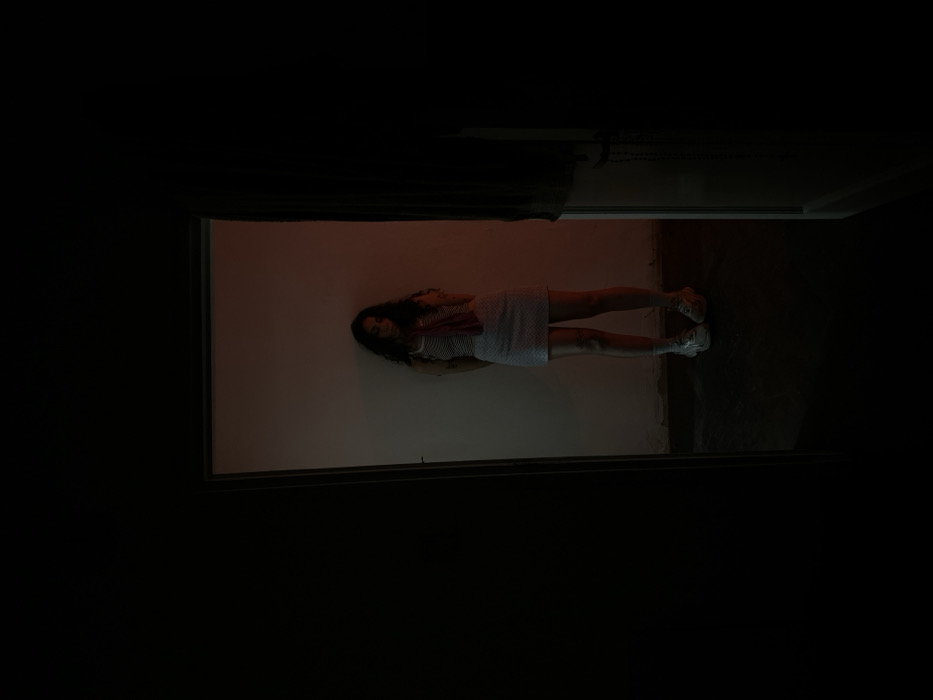 A woman in a patterned dress and sneakers stands against a light wall in a dimly lit room, as seen through a doorway or opening. The area surrounding the opening is dark, highlighting the room's illuminated wall and the woman's figure. The perspective is slightly skewed, adding a sense of visual unease. The room's details are sparse, focusing the viewer's attention on the woman's presence within the space.