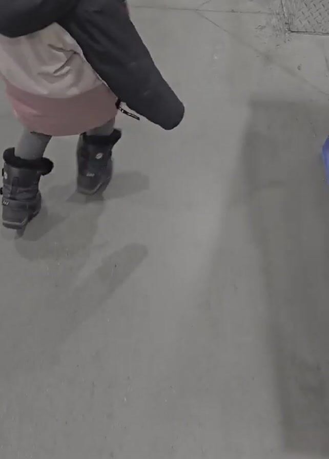 A young child, wearing a pink shirt, a dark jacket, and dark boots, walks across a gray concrete floor