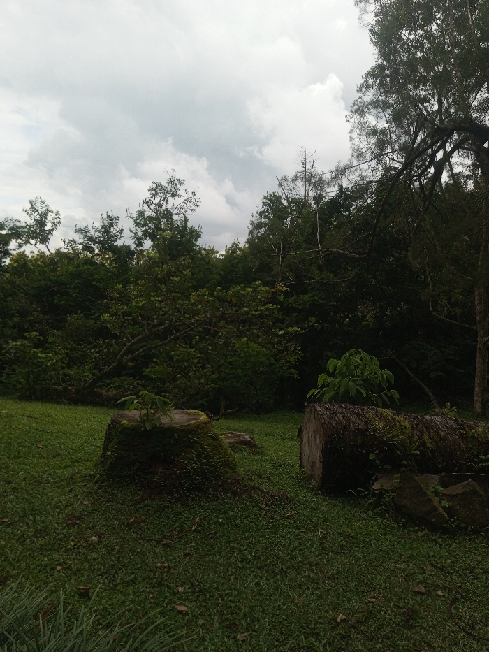 The scene depicts a natural outdoor environment in Padegaon, India, under an overcast sky. In the foreground, a moss-covered tree stump, approximately 0.5 meters in height, stands on the left, with a small plant growing from its top surface. To the right, a dark, moss-laden log, roughly 2 meters long and 0.4 meters in diameter, lies horizontally on a bed of green grass. Several dark rocks are partially visible near the log. The midground and background are occupied by a dense, dark green forest characterized by numerous trees and thick foliage. The sky above is predominantly light grey with cloudy formations. No individuals, structures, or discernible actions are observed.