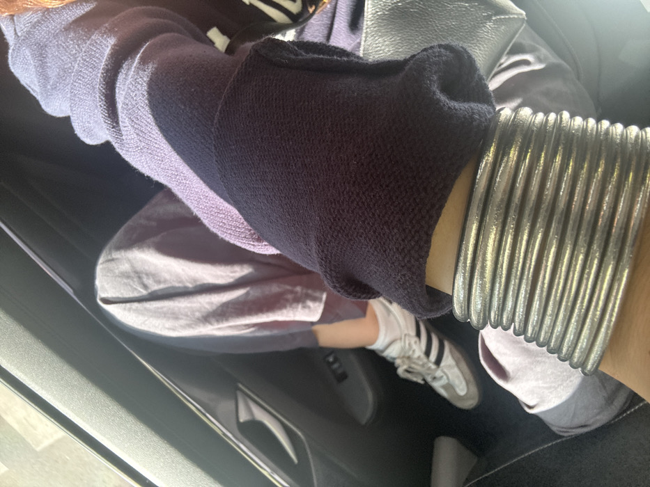 The scene depicts the interior of a vehicle in Mexico City, Mexico, under bright daylight. In the foreground, the right forearm of an individual is prominent, adorned with approximately 15-20 thin, ribbed, silver-colored bangles. This arm is clad in a dark purple, long-sleeved garment, with a lighter purple fabric visible further up. In the mid-ground, to the left, the lower legs and feet of a second individual are visible. This person wears loose-fitting, light grey or pale lavender pants or a skirt, white crew socks, and grey and white athletic sneakers with three black stripes. The vehicle's interior features dark grey or black door panel trim, including a chrome-colored door handle and black window control switches. Strong natural light streams in from the left, casting sharp shadows across the subjects and interior surfaces.