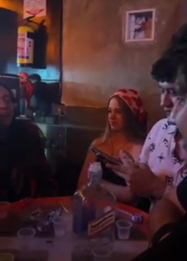 group of friends hanging out at a bar. A round table in the center of the scene has several shot glasses, a bottle of Aguardiente liqueur, lime wedges, cigarettes, and ashtrays on it. Three of the people are clearly visible. A woman wearing a red and white headscarf looks toward the person filming the video. Another woman sits beside her, gesturing and speaking. Beside them, a man with curly hair looks at his phone. The bar is dark and dimly lit. A fire extinguisher is on the wall, as well as a small framed picture.