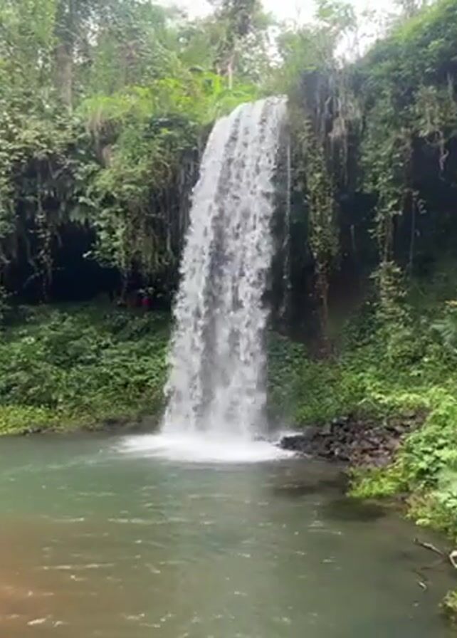 The video depicts a scenic waterfall flowing into a clear pool of water, surrounded by lush green vegetation. The waterfall is wide and the water cascades down with considerable force, creating a white frothy effect where it meets the pool below. The surrounding environment is dense with trees and various green plants, giving the scene a natural, tranquil ambiance. The water in the pool appears calm and clear, reflecting the surrounding greenery and the sky. The camera is positioned at a distance to capture the entirety of the waterfall and its immediate surroundings, showcasing the beauty of the natural landscape.