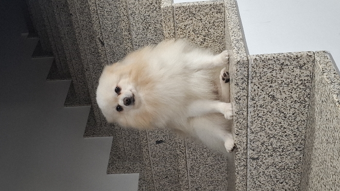 - "A small, fluffy, predominantly white Spitz-type dog with cream-colored highlights around its head and shoulders is depicted sitting on a staircase in Barcelos, Portugal" by FM-VH5CK2, licensed under CC BY 4.0