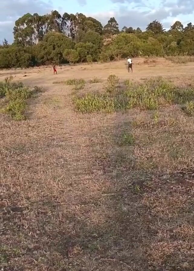 field of dry grass with some green bushes and trees in the background. There are two people in the field. One person is wearing red clothes and standing to the left, while the other person is wearing white and black clothes and standing to the right. It looks like the people might be playing a game. The sky is blue with some clouds.