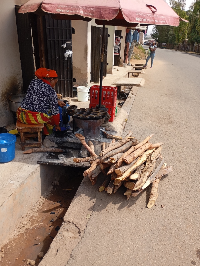 An outdoor scene captures a street vendor preparing food next to an asphalt road in the city of Unknown, Unknown