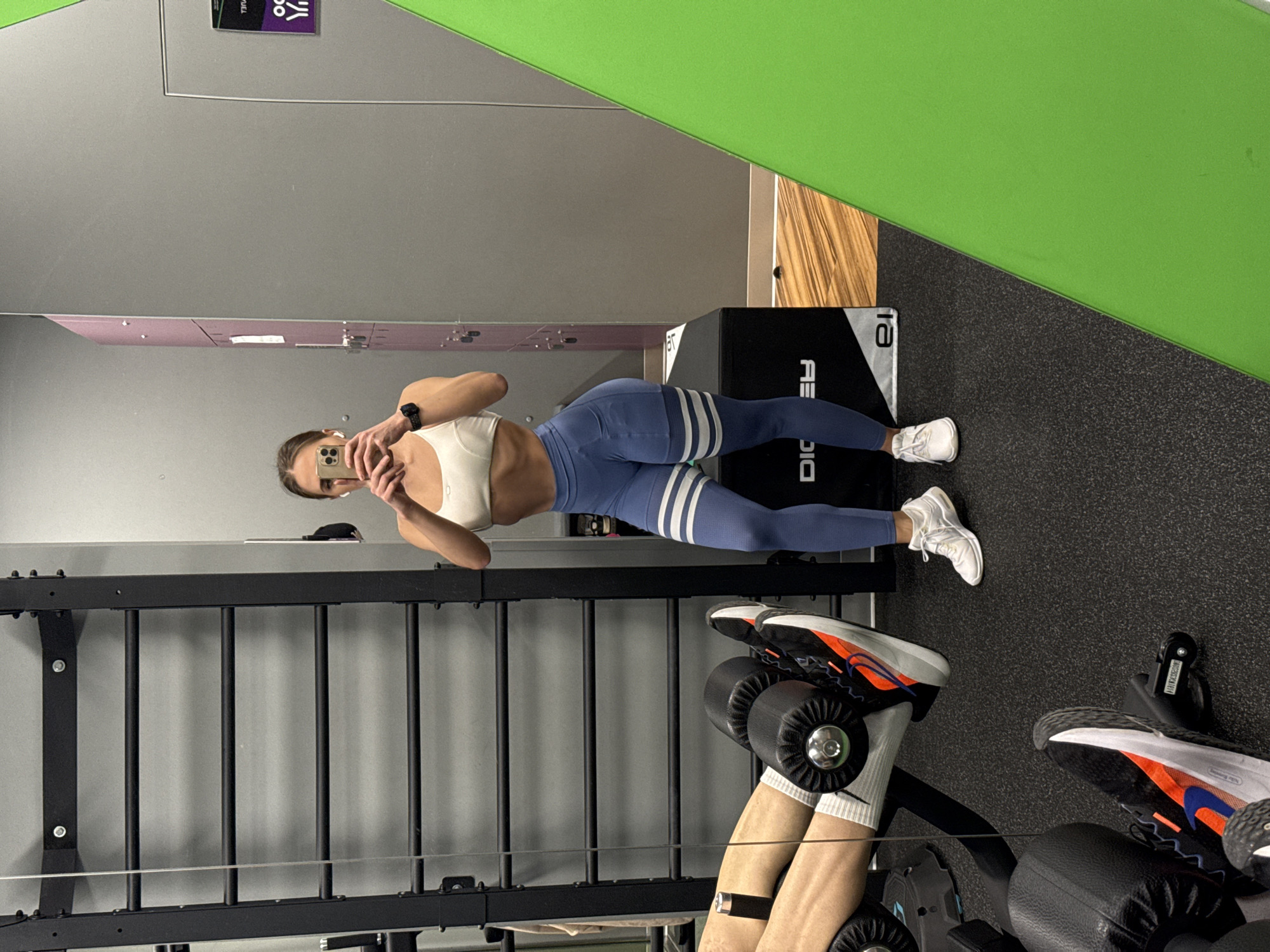 A woman in fitness apparel is taking a selfie in a gym setting