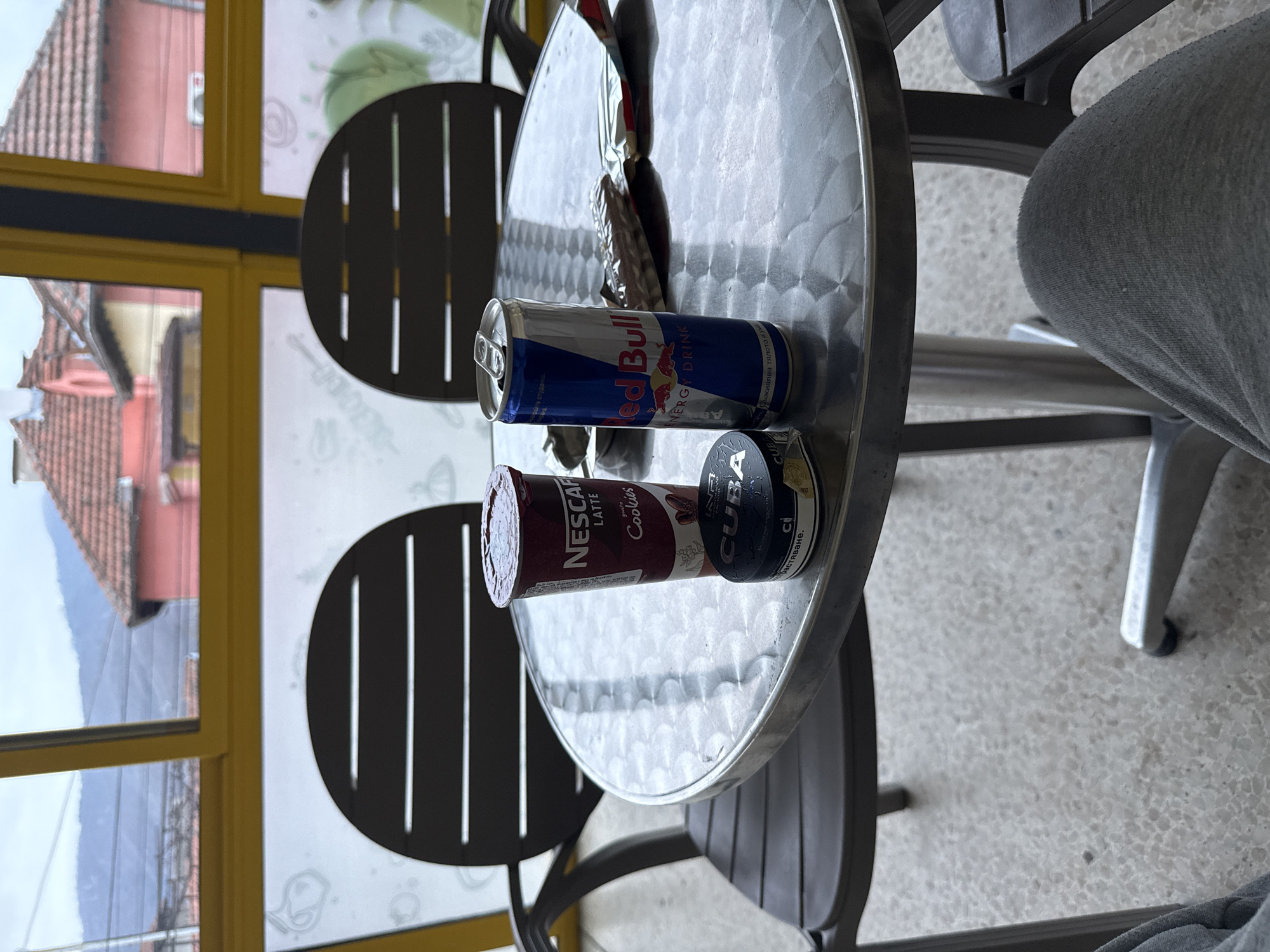 This medium shot depicts a table at a cafe in Peshtera, Bulgaria. On the table sits an open can of Red Bull energy drink, a Nescafe Latte Cookies instant coffee container with its lid open, and a snus container labeled "Cuba." Partially visible on the right side is a person wearing grey sweatpants and sitting in one of the chairs surrounding the table. In the background, a yellow-framed window provides a view of the cityscape with roofs and buildings. The scene appears to be captured during the day, likely indoors, considering the presence of indoor furnishings and the outdoor view through the window. The table is circular and seems to be made of a metal material with a patterned surface.