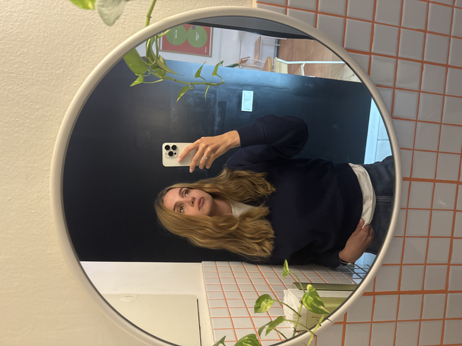 A female individual is captured in a mirror selfie within an establishment located in Tbilisi, Georgia. The subject, a light-skinned woman with wavy, light brown hair, wears a navy blue sweatshirt over a white t-shirt and blue jeans. A ring is visible on her left ring finger. She holds a white-cased smartphone in her right hand, aimed at the mirror. Her expression is neutral, and her gaze is directed towards the phone/mirror. The scene is reflected in a circular mirror with a light-colored frame. The wall surrounding the mirror and visible in the lower left reflection features white square tiles with orange grout. A green trailing plant is positioned to the left. The wall directly behind the individual, reflected within the mirror, is dark blue or black, and contains a white rectangular light switch. To the right of the reflection, a brighter area is visible, containing wooden chairs and a partially obscured framed poster with red and green circles on a light-colored wall. The environment suggests an indoor public space, possibly a cafe or restaurant.