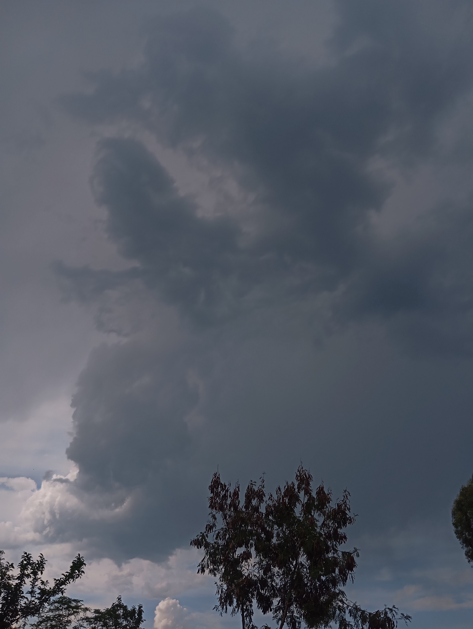 low-angle view of a stormy sky with dark, heavy clouds dominating the scene. Several trees are visible in the foreground. The lower part of the sky shows some lighter clouds or breaks in the cloud cover. The image was taken at a location in the city of Unknown, Unknown.