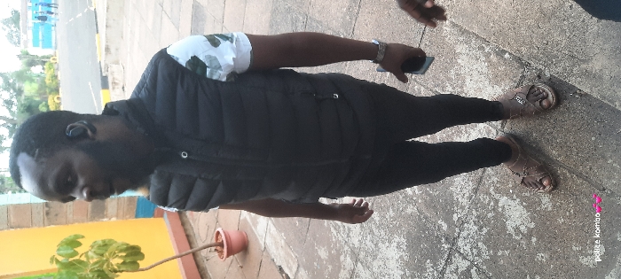 A dark-skinned man in a black puffy vest and black pants stands on a concrete surface. He wears brown sandals. He holds a cell phone in his left hand. To his left, a potted plant with green leaves is visible. In the background, a road with a yellow and black curb and a building with blue accents can be seen. The photo includes a "Police Kombo" watermark.
