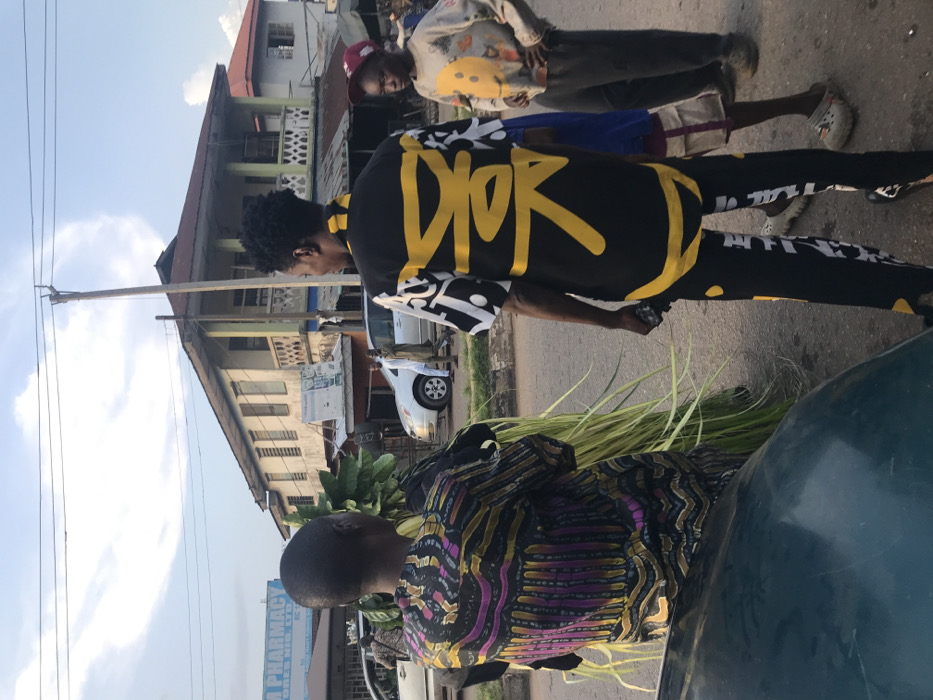 The image depicts an urban street scene in Akure, Nigeria, under a daytime sky with scattered clouds. In the foreground, the back of a person wearing a black, purple, and yellow patterned shirt is partially obscured by a large bundle of green, palm-like fronds they are holding. To their immediate right, a second individual stands with their back largely to the viewer, wearing a black short-sleeved shirt and matching pants adorned with prominent yellow, white, and black abstract designs; this individual has dark, curly hair and holds a small, dark object in their left hand. Further to the right, a younger person wearing a red baseball cap, a light-colored long-sleeved shirt with a yellow graphic, and dark pants stands with their hands on their hips, looking towards the left. The mid-ground features an asphalt street with a silver sedan parked to the right. A man in light-colored traditional Nigerian attire is visible walking away from the camera further down the street. The background is dominated by a two-story building with a light-colored facade, a red roof, and a second-story balcony featuring a green-patterned balustrade. To the left of this building, a blue sign reading "PHARMACY OBES NIG. LTD" is visible on an adjacent structure. A utility pole with overhead wires extends upwards on the right side of the image. The scene suggests a mixed-use commercial and residential thoroughfare.