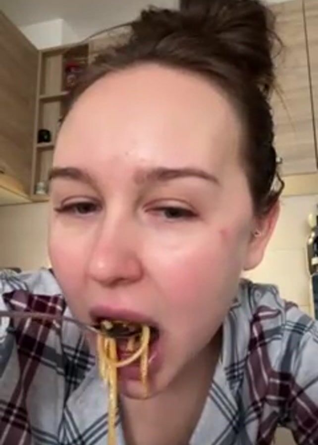 A woman wearing a plaid pajama top is eating spaghetti with a fork. Her hair is up in a messy bun. The background shows kitchen cabinets and appliances. The camera is close to her face, capturing the action of eating the spaghetti.