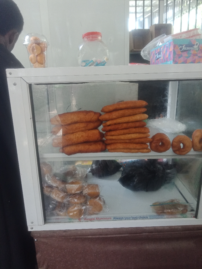 The image captures a static scene within a retail establishment in Tarauni, Nigeria, displaying baked goods and convenience items. In the foreground, a white-framed, two-tiered glass display case holds various food items. The top shelf contains two stacks of elongated, golden-brown pastries, approximately six in the left stack and ten in the middle stack, alongside three ring-shaped donuts on the right. The bottom shelf features a collection of individually wrapped light-brown muffins or cupcakes on the left, two dark plastic bags in the center, and a small, clear container with several small, round items on the far right. The bottom frame of the display case bears text, including "Rongtai Aluminium Always your best choice." On a shelf or counter above the display case, from left to right, are a clear plastic cup with a dome lid containing several small, round, golden-brown items; a clear plastic jar with a red lid holding a few colorful candies; and a clear plastic bag containing a box of "Jasmin" brand tissues. In the upper left quadrant, the back of a person's head and right shoulder, clad in dark attire, is visible, partially obscured by the display case. The background consists of a white wall, with a metal-barred window and additional indistinct objects visible on the far right.