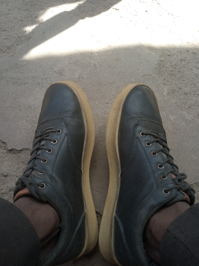 - "A downward-facing, first-person perspective image depicts two feet wearing dark grey or black lace-up shoes with thick, light tan soles" by FM-28kcB3, licensed under CC BY 4.0