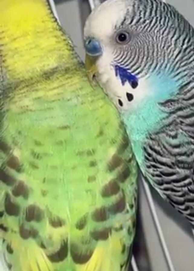 two budgerigars in a cage. One budgie is predominantly green and yellow with darker markings on its back, and the other is blue, white, and gray. The blue-and-gray budgie is nestled close to the green-and-yellow budgie, appearing to preen or nibble at its feathers. The cage is white wire with some red visible at the top. The camera is close up, focusing on the birds and their interaction. A short “ooh” sound is audible.