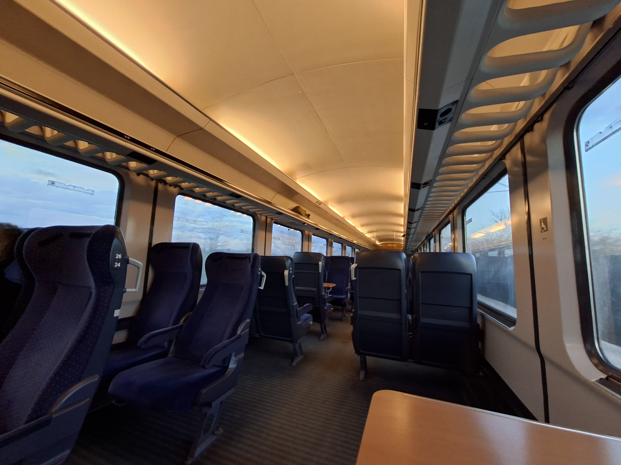 The image depicts the interior of a passenger train car, location Unknown, Unknown. The scene is illuminated by warm, yellow-orange LED strip lighting recessed into the overhead panels, complemented by natural daylight visible through the windows. The train car features multiple rows of vacant, dark blue or black upholstered seats, predominantly arranged in pairs, with gray frames. Seat numbers "26" and "24" are visible on one seat back in the left foreground. A light brown tabletop is partially visible in the bottom right corner, suggesting a table seat arrangement. The floor is covered with dark gray patterned carpeting. Rectangular windows line both sides of the carriage, offering views of an indistinct exterior landscape under a light blue sky with some cloud cover or haze. Bare tree branches are visible through some windows. Overhead, above the windows, are wave-patterned, light-colored luggage racks. The ceiling is segmented with cream-colored panels. No individuals are clearly visible within the train car. The interior appears clean and well-maintained.