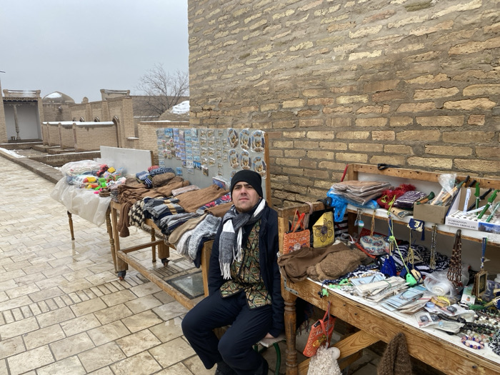 In the historic city of Khiva, Uzbekistan, an outdoor marketplace scene unfolds under an overcast sky, with traces of snow visible on distant architectural elements. A male individual, dressed in a black beanie, a grey and white patterned scarf, a dark jacket over a patterned shirt, and dark pants, is seated, facing the camera. He is positioned between two wooden market stalls laden with merchandise. The stall to the left, partially obscured, displays colorful plush toys and an upright panel filled with numerous souvenir magnets or keychains. The more prominent stall on the right features a variety of goods including folded textiles (scarves, hats), an assortment of beaded jewelry (necklaces, bracelets), small decorative bags, stacks of postcards or small prints, pens in holders, and various other trinkets. A small white sheep-shaped figurine hangs from the front of this stall. The ground is paved with light-colored rectangular tiles, appearing damp. The background consists of a tall, textured light-brown brick wall on the right. To the left, traditional mud-brick buildings with arched openings and small domes are visible, their flat surfaces lightly dusted with snow. A bare tree branch extends into the upper left portion of the frame.