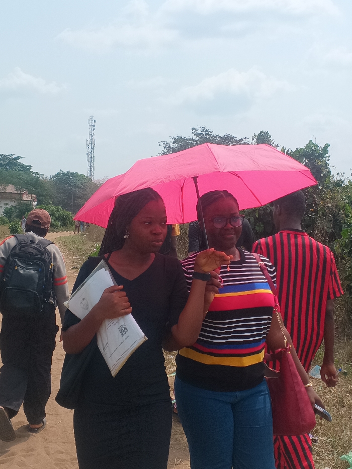 The scene depicts an outdoor daytime environment on an unpaved dirt path in Ihiagwa, Nigeria, under an overcast sky with scattered clouds. In the immediate foreground, two young females walk from right to left. The female on the left has dark skin and black braided hair, wearing a black v-neck dress. She carries white documents in her left hand and a black shoulder bag on her left side. She is looking slightly to her right. The female on the right, also with dark skin and braided hair, wears eyeglasses and a horizontally striped t-shirt featuring black, white, red, blue, and yellow stripes, along with blue jeans. She holds a bright pink open umbrella above her head, shading herself and possibly the other female, and carries a burgundy shoulder bag. Her right hand is raised, palm open. In the mid-ground, behind the foreground subjects, a male figure wearing a brown cap, a grey and orange long-sleeved shirt, and a black backpack walks away from the camera towards the left. To his right, partially obscured by the umbrella, is another male figure wearing a red and black vertically striped shirt, also walking away. Several other indistinct figures are visible further in the background. The background features green foliage and trees lining the path on both sides. On the far left, a light-colored building is visible amidst the trees. Prominently in the distant background, a tall cellular communication tower stands against the sky. The overall impression is one of people moving along a casual, undeveloped path in a semi-urban or rural area.