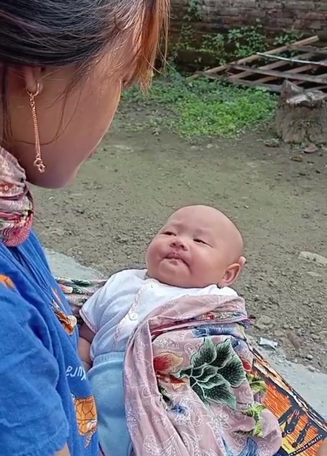 A woman is seen from the side, gazing down at a baby that she is holding. The woman has dark hair with light brown streaks framing her face, and she is wearing a blue shirt with a colorful scarf around her neck and long dangling earrings. The baby has a smooth, bald head and is wearing a white shirt and light blue bottoms, wrapped in a floral patterned cloth. The background shows a yard with dirt, grass, bricks, and greenery. The baby is lying relatively still and looking at the woman who is speaking to it.