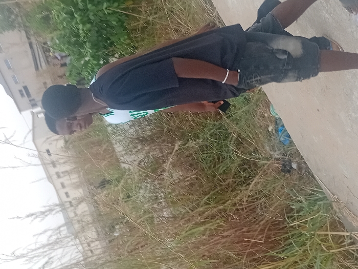 A person stands beside a concrete ledge amidst tall grass. The individual wears a white shirt with green accents, a black t-shirt, dark denim shorts, and sandals. They hold a dark object, possibly a phone, in their left hand. The background features a building with multiple stories and visible windows, suggesting an urban or suburban setting. Trash is scattered nearby, adding to the informal outdoor scene.