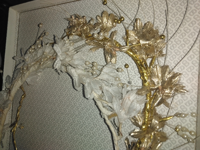 A decorative, semi-circular object is situated inside a white rectangular box with a textured internal pattern. The location is the city of Río Grande, Mexico. The object comprises a primary linear structure from which white fabric elements, metallic gold foliage, and spherical beads extend. White translucent fabric clusters, resembling flowers or bows, are attached along with multiple strands of small, off-white spherical beads (pearls) suspended by thin, silver-colored wires. Adjacent to these, gold-colored metallic foliage elements, some appearing layered or ruffled, are present. These gold elements also incorporate smaller gold spherical beads and thin metallic wires that protrude irregularly. The object rests on the bottom surface of the box, which features a repeating pattern of light gray interlocking shapes against a white background. The raised sides of the white box are visible, framing the object. No individuals or dynamic actions are depicted.